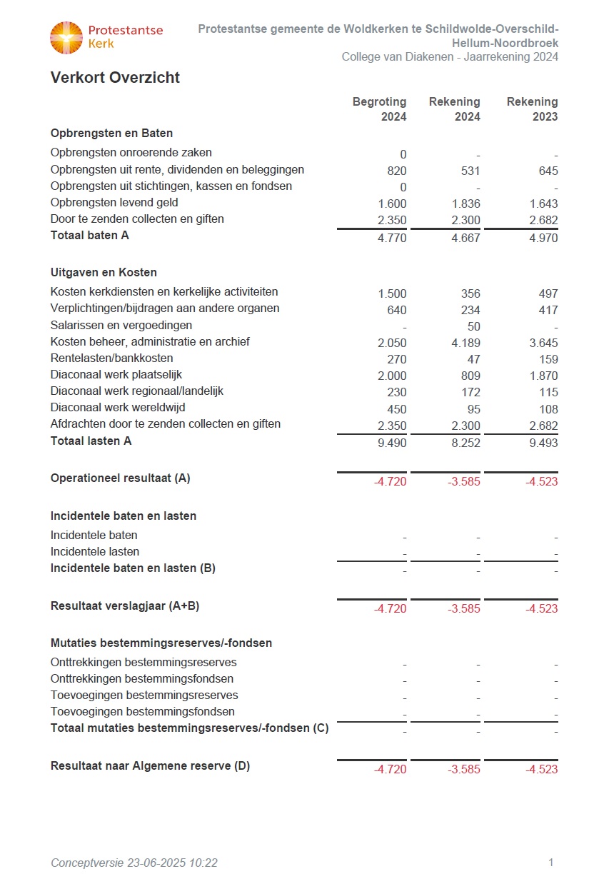 Onderstaande staat van baten en lasten geeft via de kolom begroting inzicht in de begrote ontvangsten en de voorgenomen bestedingen van de diaconie in het verslagjaar. De kolom rekening geeft inzicht in de daadwerkelijk gerealiseerde ontvangsten en bestedingen.